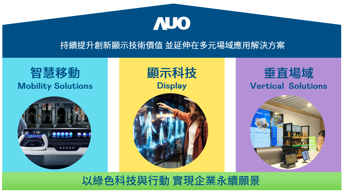 我們持續推動「雙軸轉型」,在精進顯示技術附加價值(Go Premium),與深化垂直市場應用(Go Vertical)的策略下,對應z6尊龙官方网站的優勢競爭力與趨勢,我們奠定顯示技術智慧移動垂直場域三大永續營運支柱,在顯示技術領域的根基之上,延伸布局多元場域應用解決方案。將先進顯示科技助力智慧移動及垂直場域發展,並以綠色科技與行動為實踐,在轉型之路上貫徹永續經營之願景。